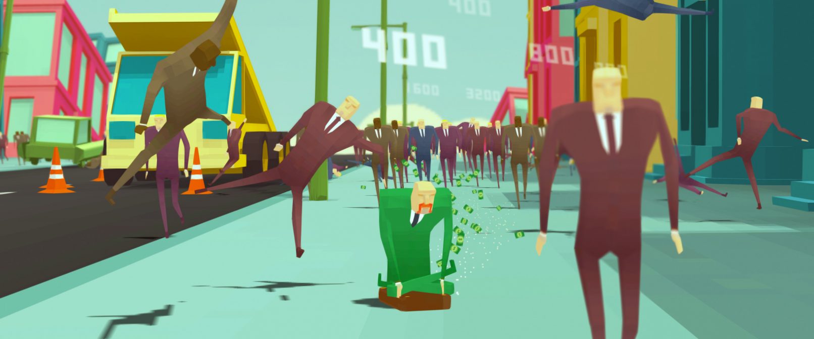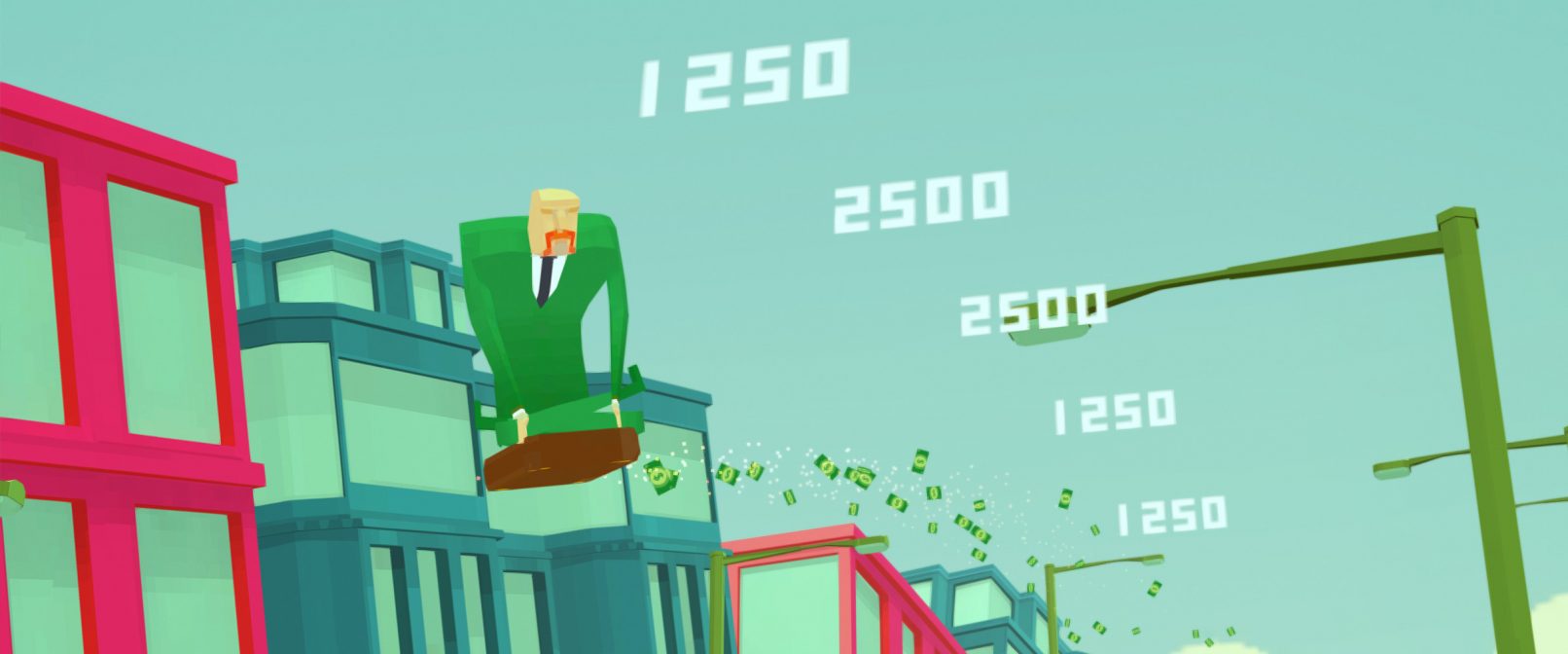 Landslide McQueen was a game made in 48 hours by a team of three. The basic idea is that he is a rich New York City stockbroker who is sick to death with the same walk home, every damn day – and so he decides to ride his briefcase home from work!